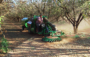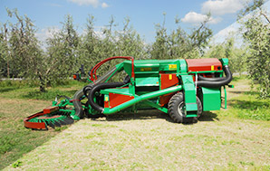 La machine est équipée d’un souffleur latéral qu’en employant l’air de l’aspiration déplace les fruits près du tronc à la rangée suivante, en rendant la récolte plus rapide.
